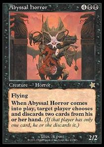 Flying When Abyssal Horror comes into play, target player discards two cards from his or her hand.