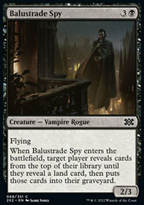 When Balustrade Spy enters the battlefield, target player reveals cards from the top of their library until they reveal a land card, then puts those cards into their graveyard.