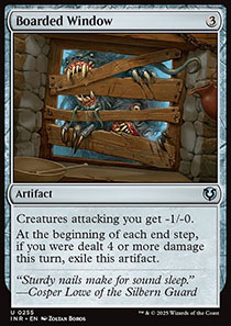 At the beginning of each end step, if you were dealt 4 or more damage this turn, exile Boarded Window.