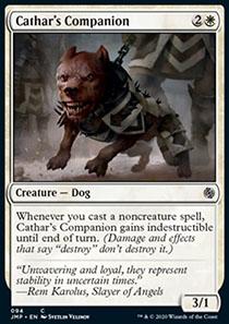 Whenever you cast a noncreature spell, Cathar's Companion gains indestructible until end of turn. (Damage and effects that say "destroy" don't destroy it.)