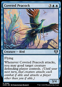 Whenever Coveted Peacock attacks, you may goad target creature defending player controls. (Until your next turn, that creature attacks each combat if able and attacks a player other than you if able.)