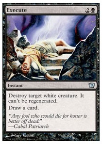 Destroy target white creature. It can't be regenerated. Draw a card.