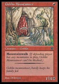Mountainwalk (If defending player has any mountains in play, Goblin Mountaineer can't be blocked.)