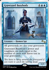 Graveyard Busybody's power and toughness are each equal to the number of cards with flavor text in your graveyards.