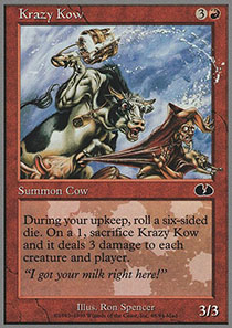 During your upkeep, roll a six-sided die. On a 1, sacrifice Krazy Kow and it deals 3 damage to each creature and player.