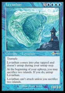 Trample Leviathan comes into play tapped and doesn't untap during your untap step. At the beginning of your upkeep, you may sacrifice two islands. If you do, untap Leviathan. Leviathan cannot attack unless you sacrifice two islands.