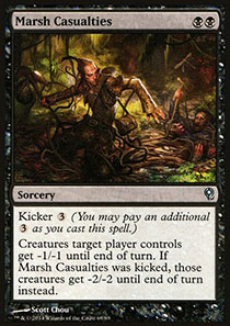 Creatures target player controls get -1/-1 until end of turn. If Marsh Casualties was kicked, those creatures get -2/-2 until end of turn instead.
