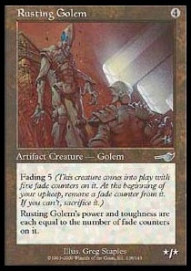 Fading 5 (This creature comes into play with five fade counters on it. At the beginning of your upkeep, remove a fade counter from it. If you can't, sacrifice it.) Rusting Golem's power and toughness are each equal to the number of fade counters on it.