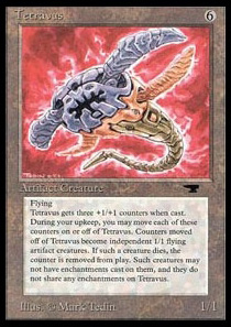 At the beginning of your upkeep, you may remove any number of +1/+1 counters from Tetravus. If you do, put that many 1/1 colorless Tetravite artifact creature tokens onto the battlefield. They each have flying and "This creature can't be enchanted."